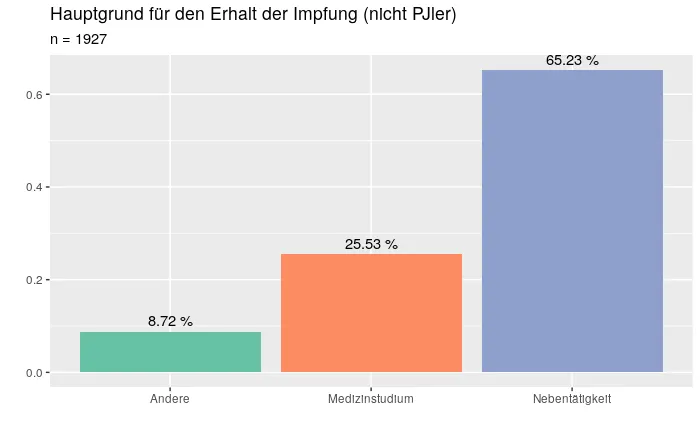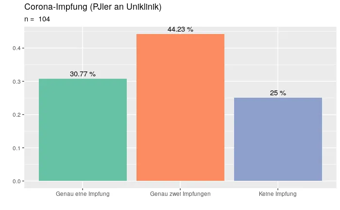 Im Zeitraum der Umfrage waren 50.6% aller befragten Medizinstudierenden ungeimpft, 27,75% hatten eine und 21,63% zwei Impfungen erhalten; wobei über 60% der Nicht-PJ-Studierenden angaben, ihre Impfungen im Rahmen von Nebentätigkeiten erhalten zu haben. Fast 10% der Teilnehmenden im PJ haben Ihre Impfung nicht aufgrund ihres PJs allein bekommen. Die Impfquoten der Medizinstudierenden sind auch auf das Engagement einiger Fakultäten zurückzuführen. Hier sind der bvmd deutliche Unterschiede zwischen verschiedenen Fakultätsstandorten, Lehrkrankenhäusern und Universitätskliniken bekannt.
